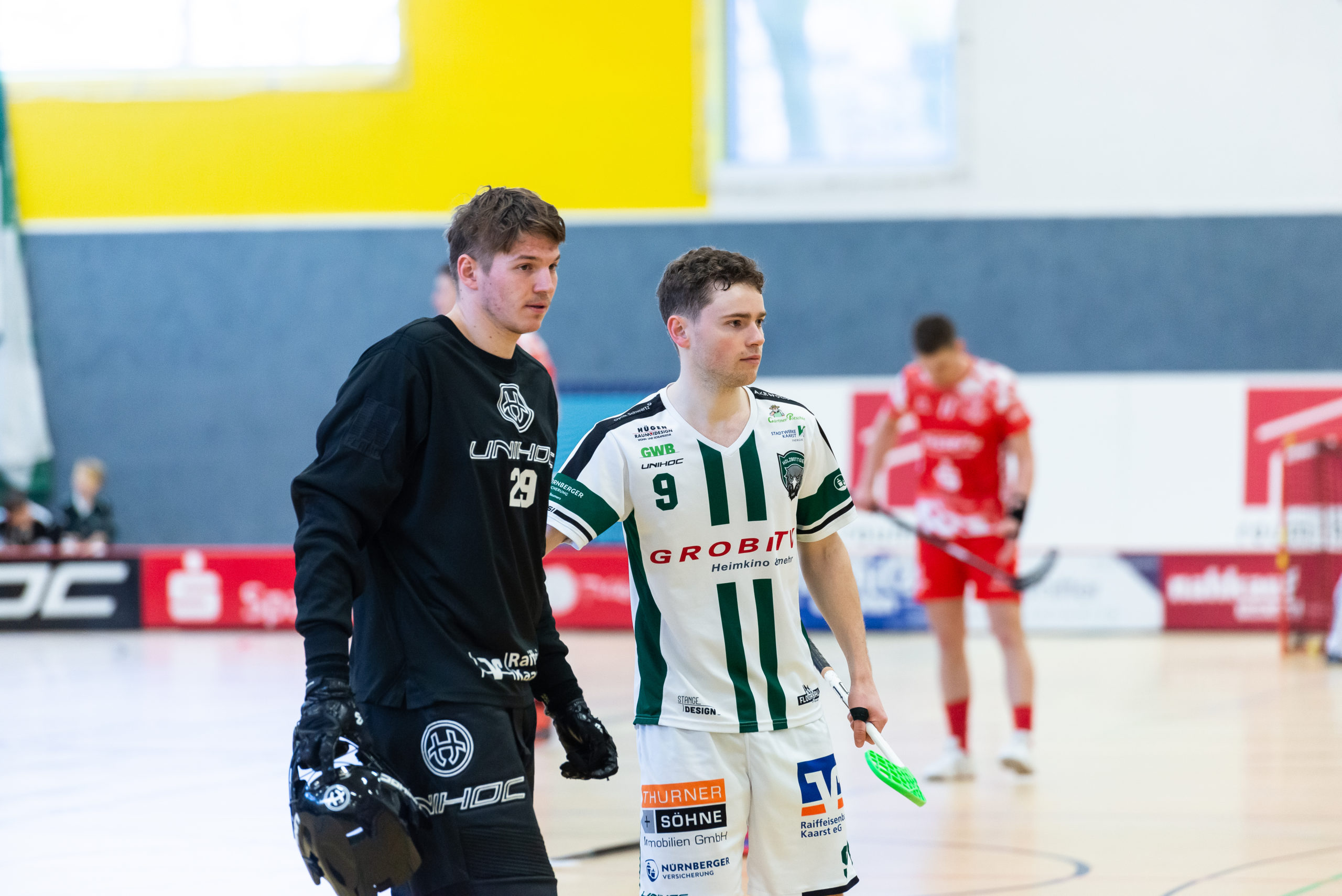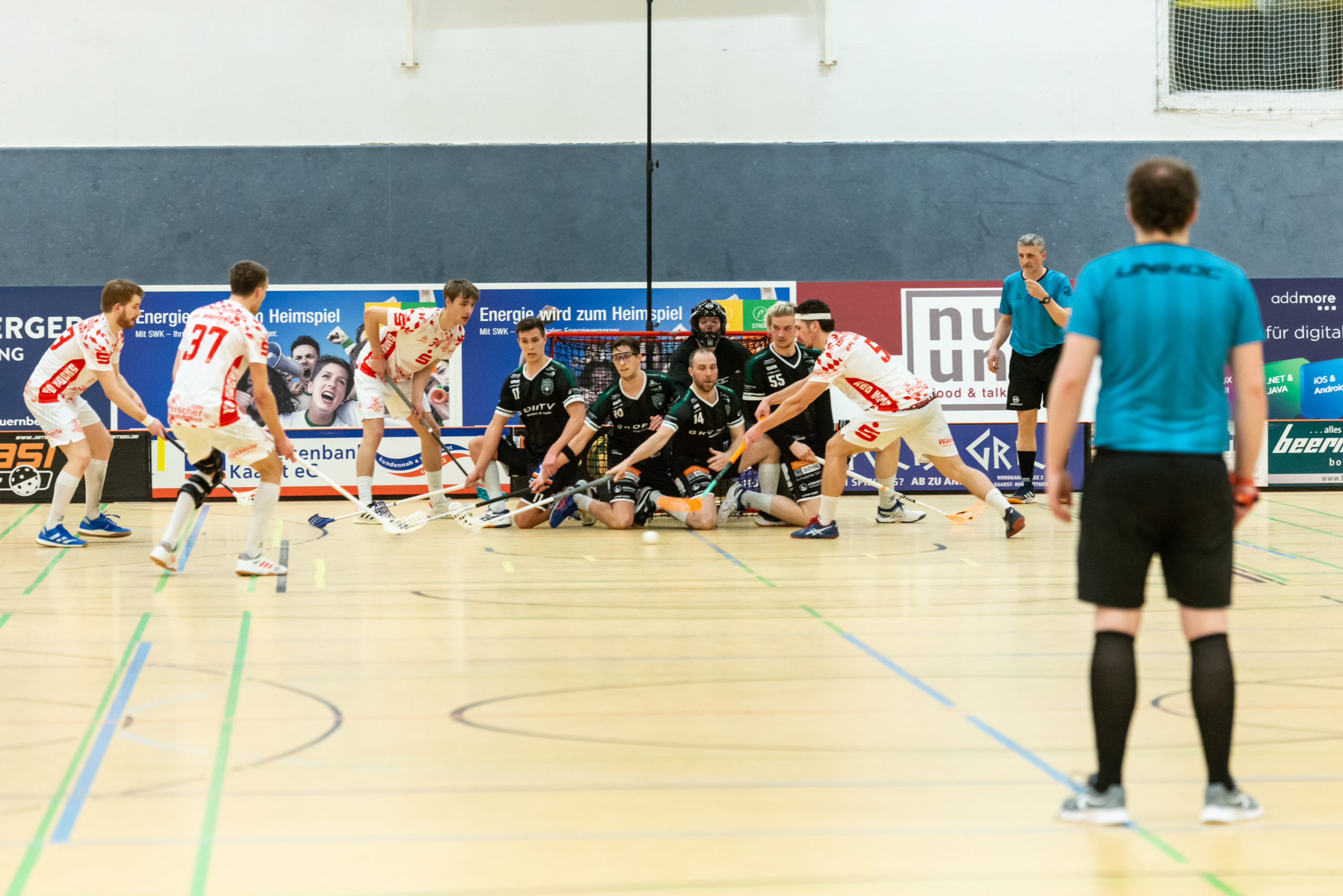 So konnte es aus Sicht der DJK-Fans weitergehen. Doch in Spiel drei traten die Red Hocks deutlich wacher und durchschlagsfähiger auf. Das Spiel kontrollierte die DJK zwar aufs Neue, aber Kaufering setze immer wieder gefährliche Nadelstiche und übernahm sogar die Führung. Diese hielten die Gäste eine ganze Weile und wurden immer gefährlicher. Eine Qualität, die das Team aus Kaufering sowohl sympathisch als auch brandgefährlich macht. Harter Körpereinsatz, gefährliche Schüsse, schnelle und vertikale Pässe, gutes Blocken – die Red Hocks boten einiges. Zudem verlor sich gerade im 2. Drittel die DJK immer wieder in individuellen statt kollektiven Lösungen. Im 3. Drittel vermochten die Holzbüttger dann aber wieder ihre Qualität auf die Platte zu bringen, vor allem durch gemeinschaftliches Verteidigen und geduldiges Ausspielen der zahlreichen Chancen. Am Ende setzt sich die DJK willensstark mit 5:3 durch und zieht letztlich verdient ins Halbfinale der Playoffs ein. Als Torschützen der DJK brachten sich Nils Hofferbert, Niklas Bröker, Niklas Stammen und zweifach Janos Bröker auf die Scorertafel.