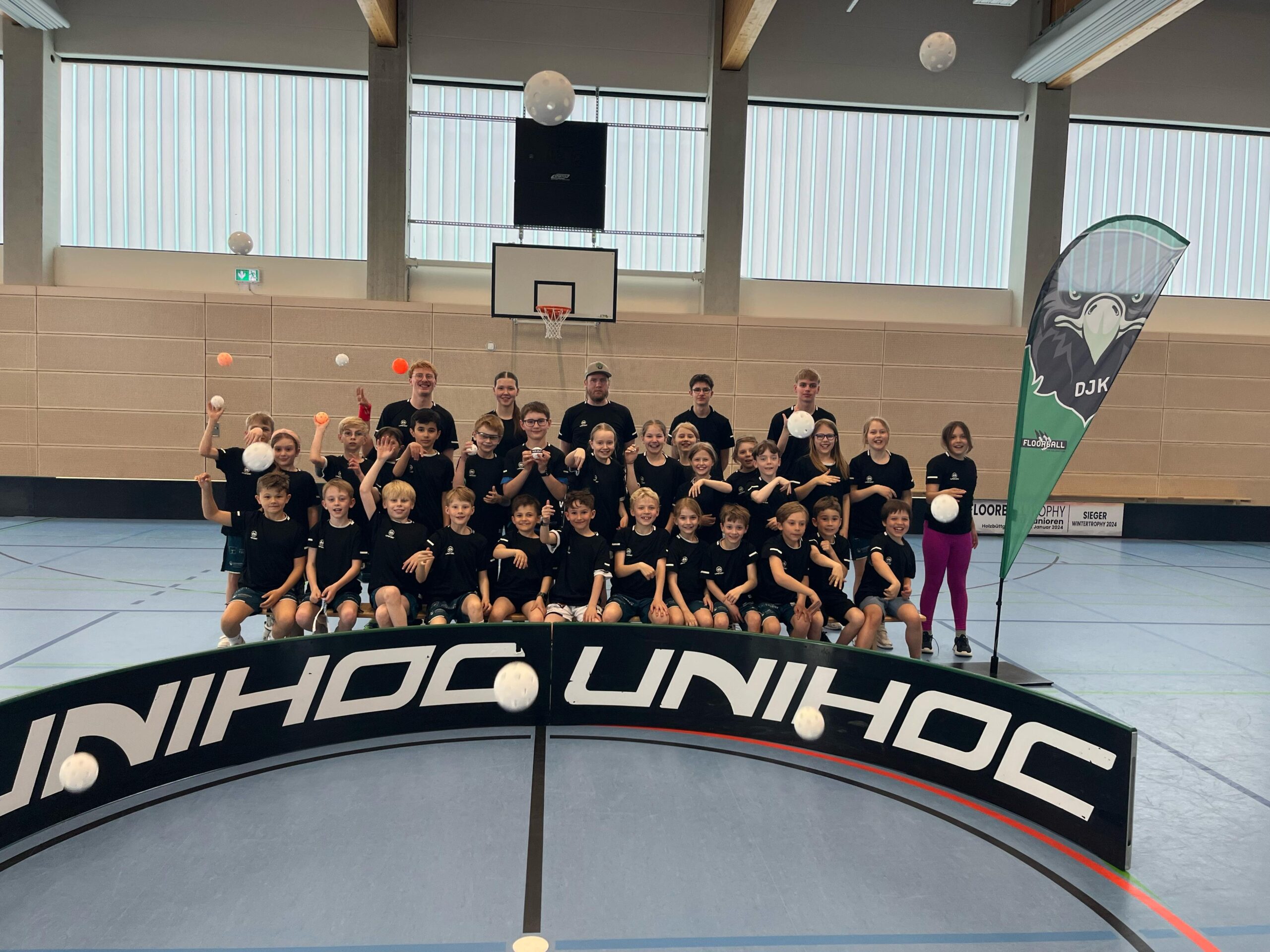 Bereits zum 13. Mal fand in den Osterferien das UNIHOC Floorball Ostercamp der DJK Holzbüttgen statt. Dieses Jahr wurde das „FLOC25“ erstmals in beiden Wochen der Osterferien angeboten. Die Floorballabteilung der DJK Holzbüttgen verzeichnete einen neuen Teilnehmerrekord und begrüßte in beiden Ferienwochen zusammen insgesamt 67 Kinder zwischen 7 und 15 Jahren, die von 9 Floorball-Trainerinnen und Trainern in der Sporthalle der Gesamtschule Büttgen betreut wurden. Zahlreiche ehrenamtliche Helfer sorgten für den reibungslosen Ablauf der Camptage sowie für die Verpflegung der Teilnehmer.