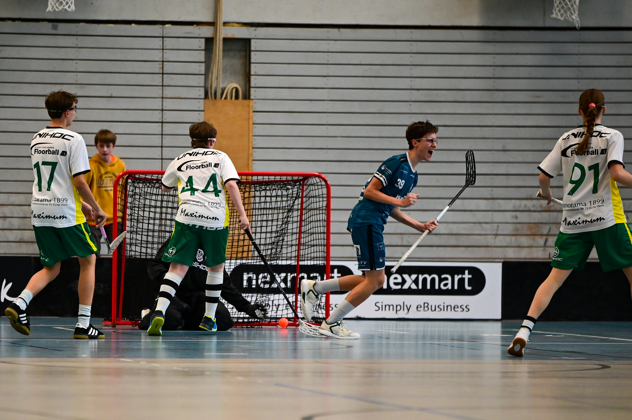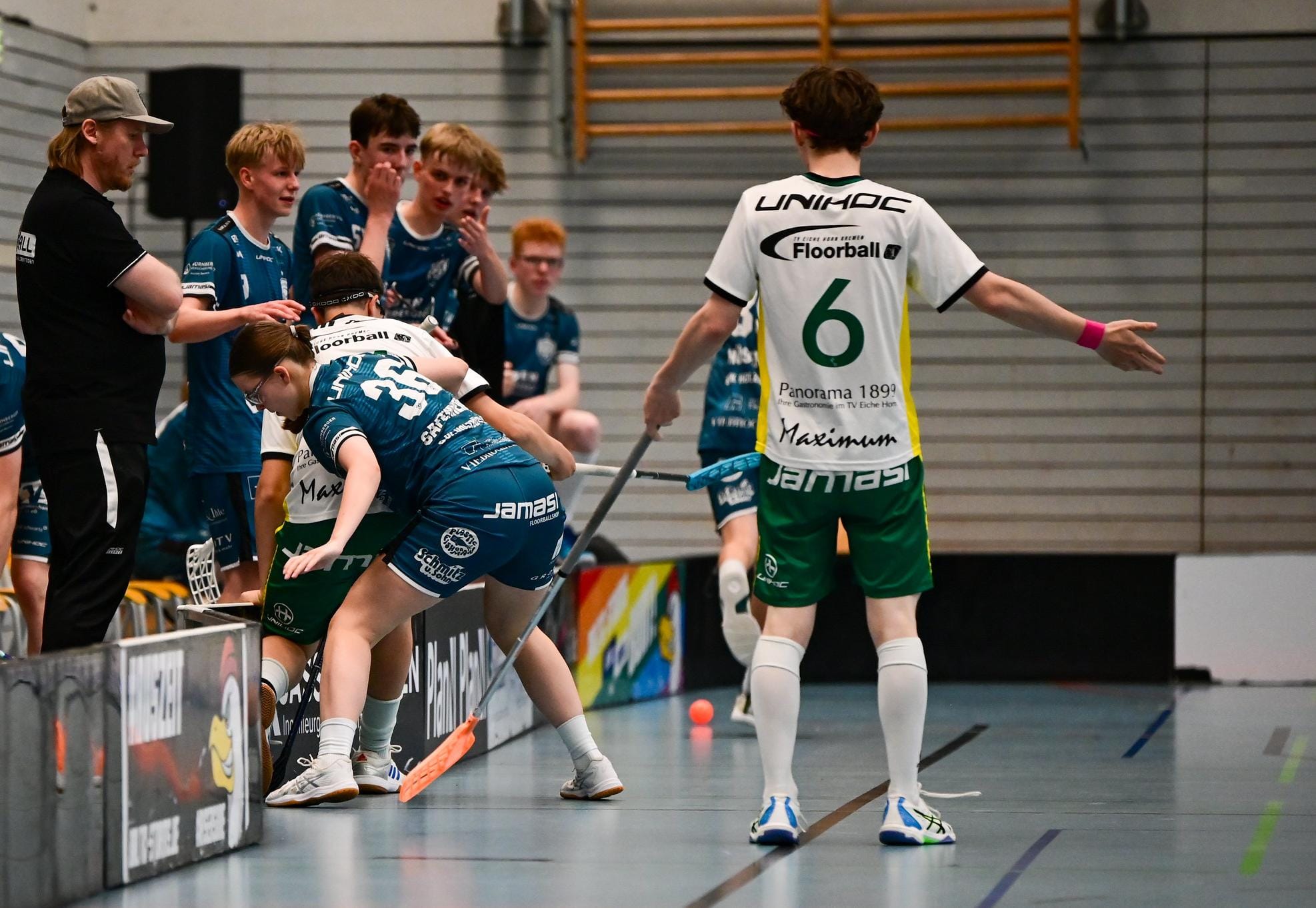 Mit diesem Schwung ging es ins zweite Gruppenspiel gegen den TV Eiche Horn Bremen. Die Holzbüttgener knüpften direkt an ihre starke Endphase aus dem ersten Spiel an: Früh gelang in Überzahl der Führungstreffer, der der Mannschaft in der Folge das nötige Selbstvertrauen gab. Mit schönem Kombinationsspiel wurde die Führung bis auf 5:0 ausgebaut. Bremen blieb trotz des deutlichen Rückstandes bis zum Schluss gefährlich, konnte aber nur noch auf 5:2 verkürzen. Damit sicherte sich die DJK Holzbüttgen den Gruppensieg und zog verdient ins Halbfinale ein.