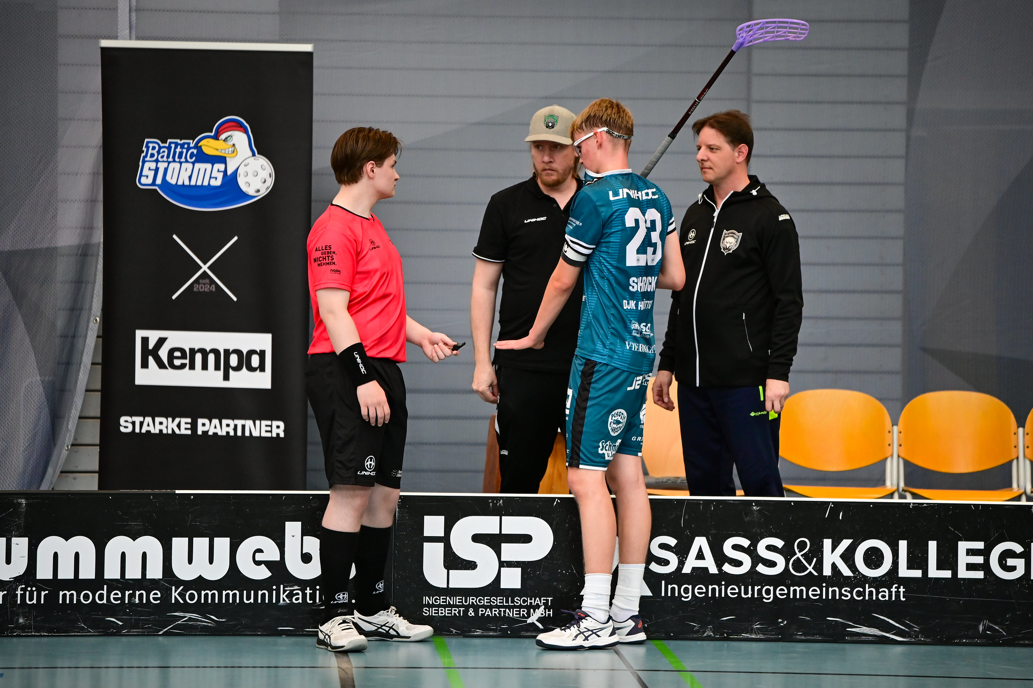 Am Sonntag wartete mit den Baltic Storms aus Kiel der Gastgeber – ein Team, das bereits in der Vorrunde mit seinem offensiven Spiel beeindruckte. Auch gegen die DJK zeigten die Storms ihre große Klasse: Bereits nach 20 Minuten lag Holzbüttgen scheinbar aussichtslos mit 0:3 zurück. Doch die Mannschaft gab sich nicht auf, kämpfte sich eindrucksvoll zurück und konterte das offensive Pressing der Storms seinerseits mit sehenswert herausgespielten Toren. Bis zur Mitte des letzten Drittels konnte die DJK Holzbüttgen auf 6:8 verkürzen. Ein verwandelter Penalty in der 45. Minute sorgte für eine dramatische Schlussphase, doch der Ausgleichstreffer wollte nicht mehr fallen. Somit endete das Halbfinale denkbar knapp mit 7:8 für die Hausherren aus Kiel.