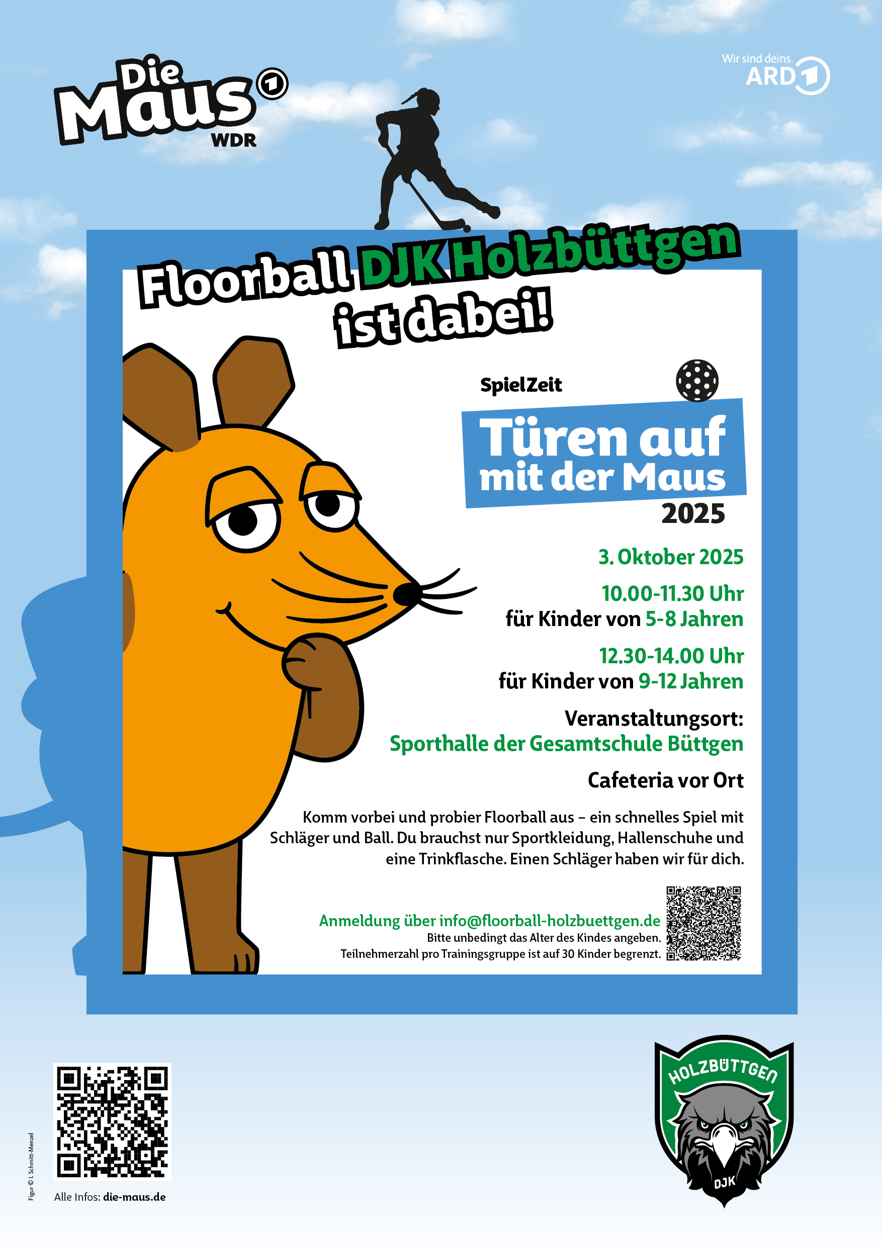 Am Maus-Tür-Öffner-Tag 2025 mit dem Motto „Spiel Zeit!“ machen wir unsere Halle für euch auf und zeigen euch, was Floorball ist.