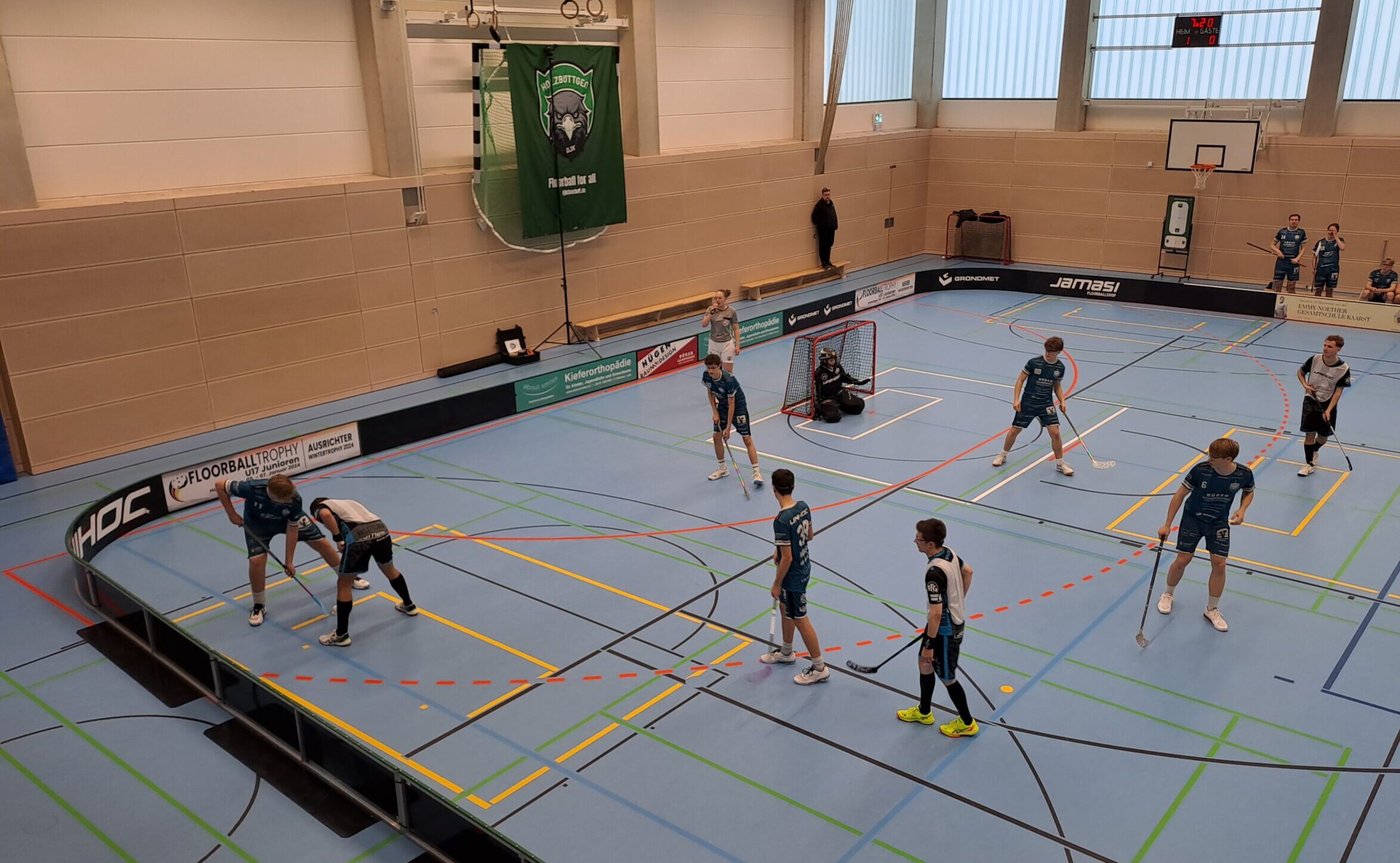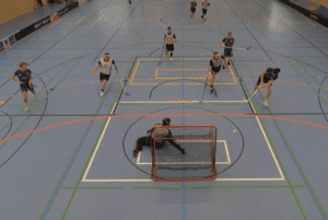 Zu Beginn des letzten Drittels erhöhte Bielefeld sogar auf 3:5. Doch gerade die erste Reihe der Adler wich nicht vom Matchplan ab, passte beharrlich und konzentriert um den Torraum herum und wartete auf die Lücke, die sich dann auch in der 37. Minute für den 4:5 Anschlusstreffer bot. Die Teutonia nahm daraufhin direkt die Auszeit und kam nach dieser mit viel Energie auf den Platz, setzte die DJK-Verteidigung direkt zu dritt unter Druck. Dieser gelang es den Ball irgendwie nach vorne zu bringen, wo die eigenen Flügel nun Platz für den 5:5 Ausgleich hatten.