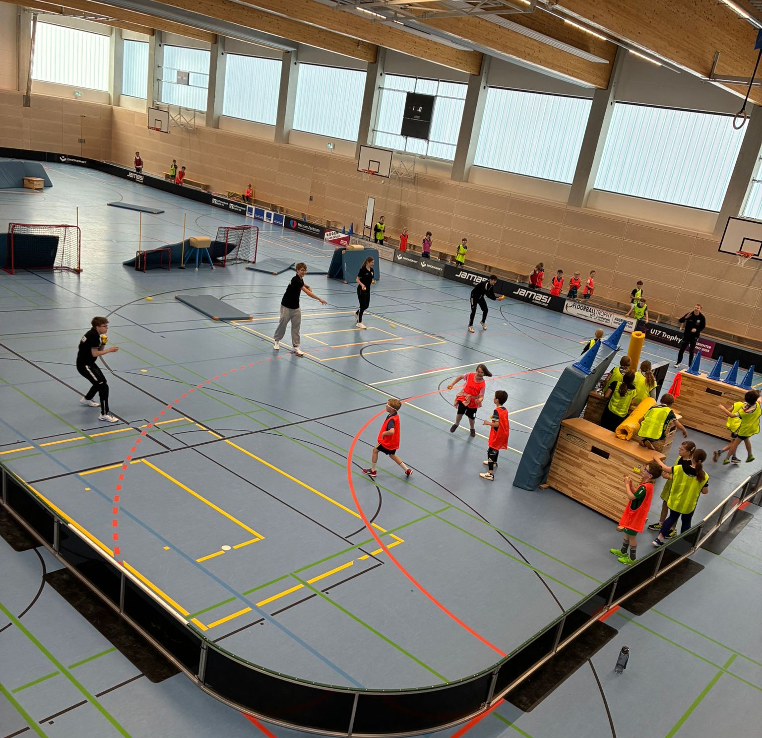 Dieses Jahr übten 33 Kinder im Alter zwischen 7 und 12 Jahren vier Tage lang von jeweiĺs 10 bis 16 Uhr intensiv Floorball zu spielen. Das Konzept des Floorball Ostercamps, ausgiebig Floorball zu trainieren in Verbindung mit ganz viel Spaß, kam auch in diesem Jahr wieder hervorragend an. Von der Ballbehandlung über das Passen bis hin zum Schießen standen für die jungen Floorballbegeisterten viele Übungen und Spielvarianten auf dem Programm des viertägigen Floorballcamps.